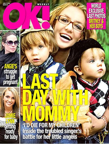 But what really caught my eye about this article is the "world exclusive last photos Britney and her boys" line on the cover. Did OK! expect Britney to be dead by the time this article came out?